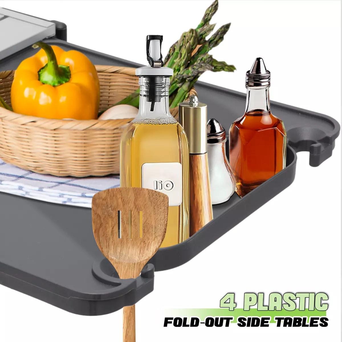 Διαθέτει πάγκο από αλουμίνιο, κάτω σχάρα για αποθήκευση και τέσσερα πλαστικά πτυσσόμενα πλαϊνά τραπεζάκια.
